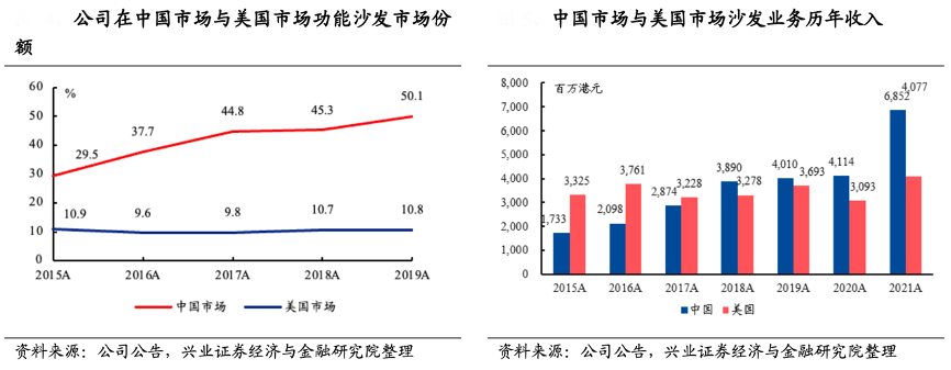 經典案例:根據公司公告、興業證券經濟與金融研究院等綜合資訊表明,敏華控股公司多年來在中國市場保持領先地位,市占率從 2015 年的 29.5%提升至 2019 年的 50.1%,已然是中國功能沙發的絕對龍頭。其在美國功能沙發競爭格局逐步分散的環境下市占率多年來維持在10%左右的水平。其亦多年來保持在美國家具市場前十大供貨商的地 位。