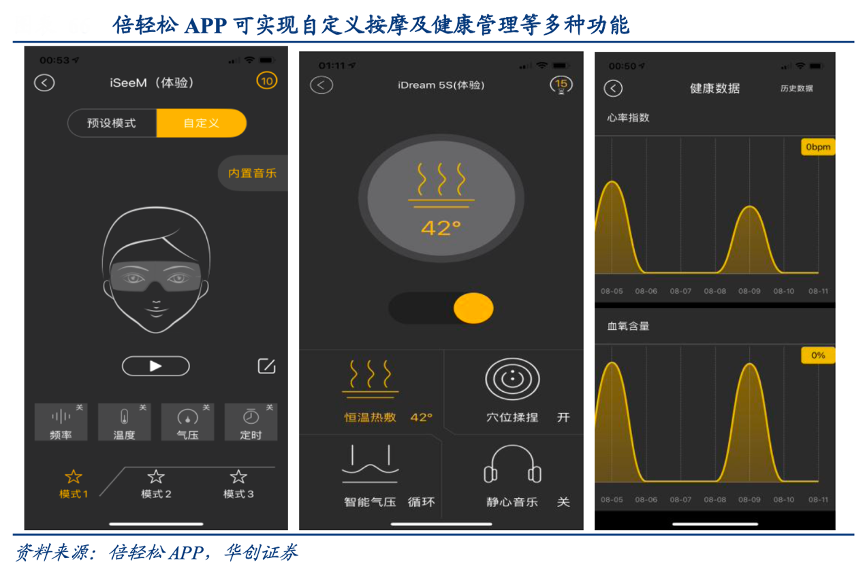 經(jīng)典案例:根據(jù)倍輕松APP、華創(chuàng)證券等綜合資訊表明,倍輕松用戶可通過手機等移動終端設(shè)備與按摩器相連接,監(jiān)測和管理個人健康狀況,并進行溫度調(diào)節(jié)、按摩程式設(shè)計等自定義設(shè)置,同時還能 DIY 按摩組合。同時其在大數(shù)據(jù)分析的輔助下為用戶提供更豐富的健康服務(wù),如遠程推送更適合的按摩程式。但當前該技術(shù)研發(fā)應用有限,除倍輕松 APP 外其他技術(shù)仍處研發(fā)階段。