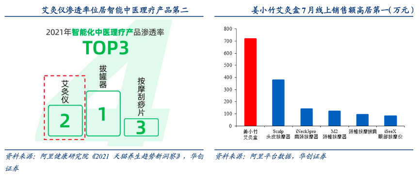 經(jīng)典案例:根據(jù)阿里健康研究院、阿里平臺數(shù)據(jù)、華創(chuàng)證券等綜合資訊表明,除眼部、頸部、頭部等現(xiàn)有主流產(chǎn)品外,倍輕松公司還在積極拓展新的產(chǎn)品矩陣以觸達更多消費人群。根據(jù)阿里健康研究院的數(shù)據(jù)顯示,在智能化中醫(yī)醫(yī)療產(chǎn)品中艾灸儀的滲透率高居第二,而倍輕松推出的“智能艾灸盒”采用真明火懸灸,燃燒釋放的有益微量元素可被人體吸收,7月銷售額達到 717.8 萬元,超過第二名約90%,位居公司 SKU 線上收入之首。