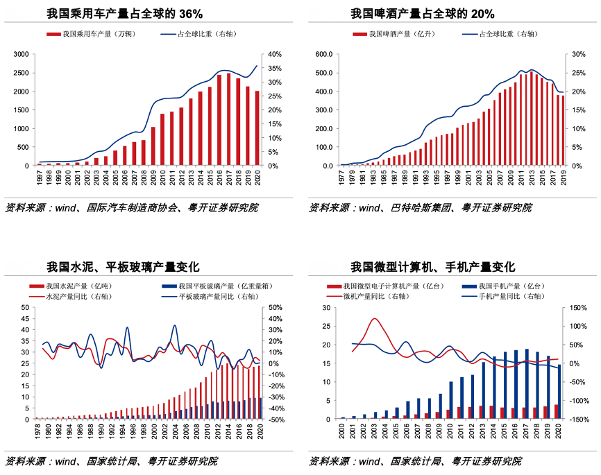 經典案例:根據wind、國際汽車制造商協會、巴特哈斯集團、粵開證券研究院等綜合資訊表明,我國各類工業品產量大幅增長,220多種工業產品產量位居世界首位。原材料類工業品產量增長對工業化建設形成保障,如我國粗鋼產量已達到 100 萬噸量級,占全球粗 鋼產量比重達 53%,鋁冶煉產量占全球的 57%,水泥、平板玻璃等產品產量大幅提升。 消費類工業品產量增長積極滿足國內外市場需求,如我國乘用車產量已達到全球的 36%, 計算機、手機等產品產量大幅上升。