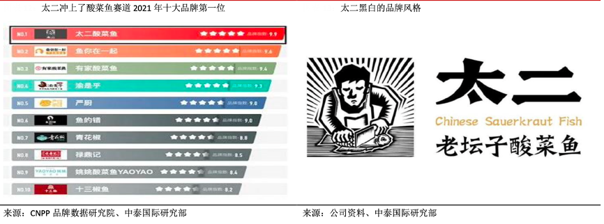 經典案例:根據CNPP品牌數據研究院、公司資料、中泰國際研究部等綜合資訊表明,九毛九早年切入酸菜魚賽道成立“太二”,從營銷、門店設計、餐牌等都迎 合年輕人的喜好。餐廳內采用吸睛的宣傳手法,裝飾設計成網紅風及漫畫風等,突出品牌的個性化,使消費者更容易辨認。根據管理層透露,太二的微信官方賬號訂閱人數超過 1,300 萬,核心粉絲數達 30 萬名,平均每篇推文閱讀量超過10萬。