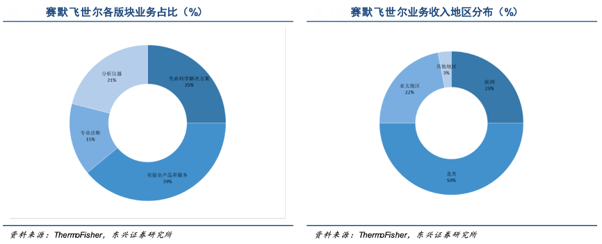 經典案例:根據ThermoFisher、東興證券研究所等綜合資訊表明,賽默飛世爾目前主要的收入來源地為北美(占比50%)、歐洲(25%)和亞太地區(22%)。其中中國地區增長最為迅猛,2019年賽默飛世爾在中國地區收入達到約 26 億美元,占總收入比重約10%。