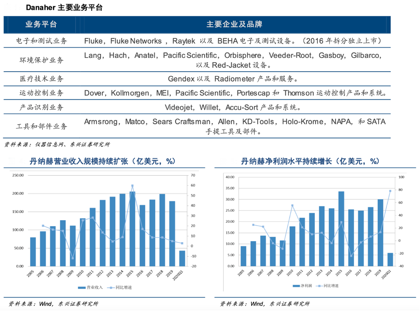 經典案例:根據儀器信息網、wind、東興證券研究所等綜合資訊表明,2019 年,丹納赫營業收入達到 179.11 億美元,凈利潤達到 30.08 億美元。截止 2020 年 5 月 26 日,丹納赫公司總市值達到 1106 億美元。