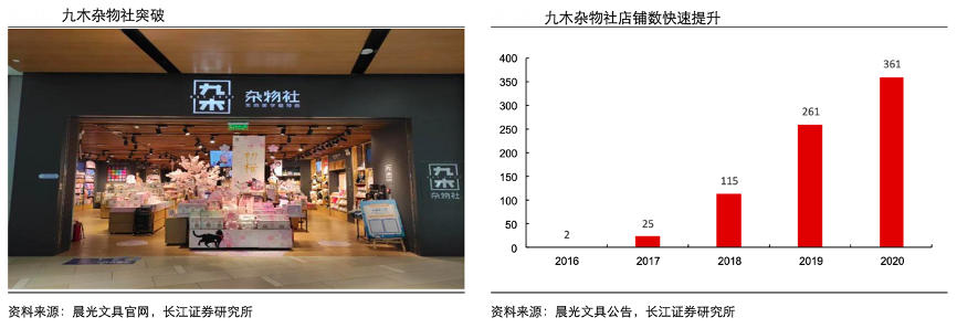 經典案例:根據晨光文具官網、公司公告、長江證券研究所等綜合資訊表明,九木雜物社于 2016 年正式推出,面向 15-35 歲年輕女性群體,多開設在購物中心內,產品品類包括盲盒公仔、手工拼搭、家居日用、手賬文具、穿搭配飾、生活數碼和禮信小物,2018 年開放加盟,到 2020 年已 經有 361 家門店(其中直營 237 家,加盟 124 家)。