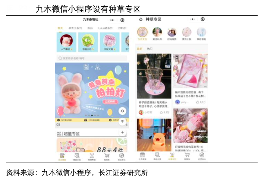 經典案例:根據九木微信小程序、長江證券研究所等綜合資訊表明,九木雜物社利用微信小程序作為流量入口,借助微博話題營銷、小紅書等引流,在小程序上開設種草專區鼓勵買家表達購物體驗,充分利用社交電商的示范效應。
