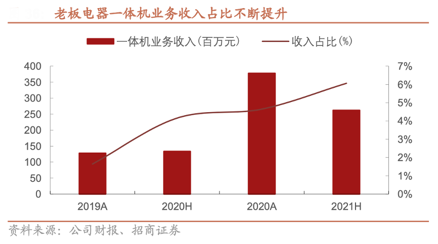 經典案例:根據公司財報、招商證券等綜合資訊表明,2017年老板以蒸烤一體等多功能指標作為嵌入式品類主要開發方向,于次年推出首款蒸烤一體機產品,目前已覆蓋包括蒸烤一體、蒸烤炸一體、蒸烤微一體、烤煎炸一體等在內的多個品類,并作為第一起草單位主導制定了我國蒸 烤一體機行業標準。根據奧維云網,2020年其嵌入式一體機線下 KA 渠道份額已達到 31.5%,位居第二,全年公司蒸烤一體機品類共實現營業 收入 3.8 億元,同比增長 196%,占營業收入比例同比提升 3.0 pct 至 4.6%。