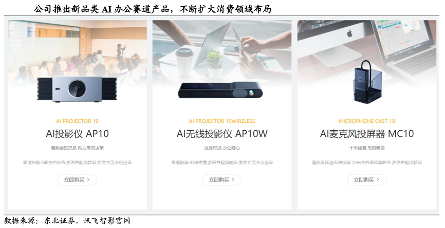 經典案例:根據東北證券、訊飛智影官網等綜合資訊表明,2021 年 9 月 27 日,科大訊飛公司推出訊飛 AI 投影儀 AP10、訊飛 AI 無線投影儀 AP10W、訊飛 AI 麥克風投屏器 MC10 三款全新辦公產品,持續賦能辦公場景,為職場人群帶來全新的會議記錄方式。其產品主要面向學習、辦公等場景,避開較為其他較成熟的智能 硬件領域和綜合性大型競爭對手,在語音交互等需求旺盛的場景發揮公司相關技術積累,突出競爭優勢。