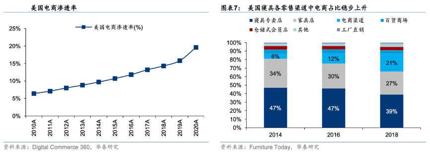 經典案例:根據Digital Commerce 360、Furniture Today、華泰研究等綜合資訊表明,在電商平臺崛起、消費者消費習慣改變、物流條件改善、床墊廠商推動產品及服務創新等因素共同推動下,近年來美國床墊消費線上渠道占比快速提升,據 Furniture Today 數據,2018年電商渠道收入占到美國寢具零售渠道的 21%,較 2016 年上升9pct。根據 Statista 統計,2021年美國床墊線上銷售比例預計達27%。