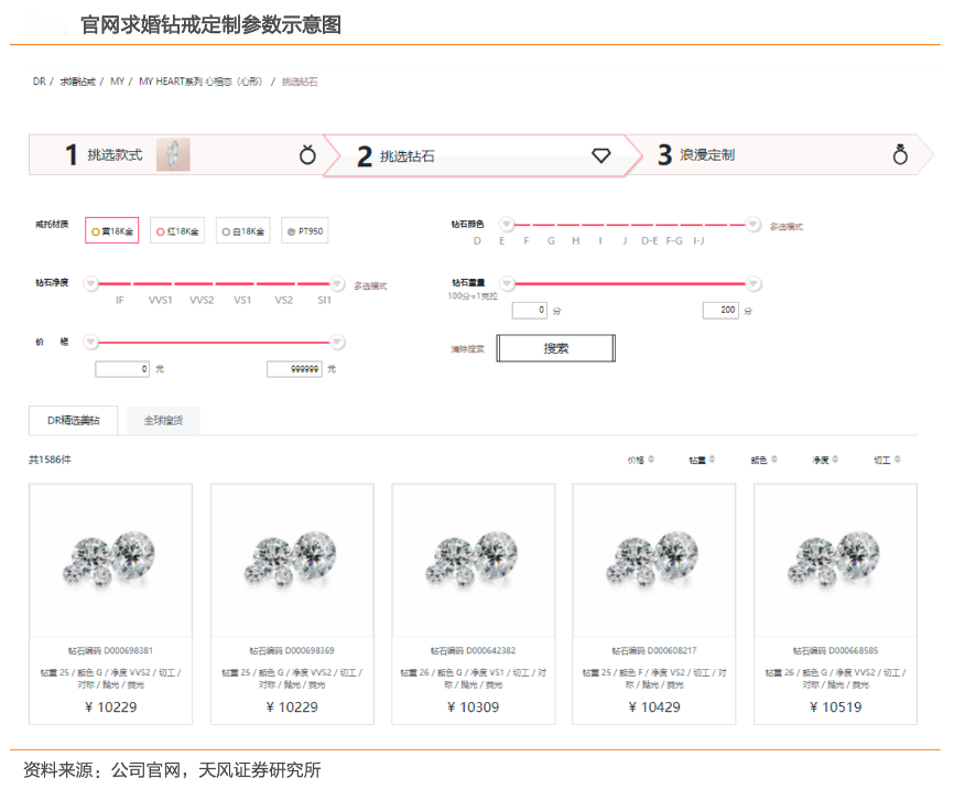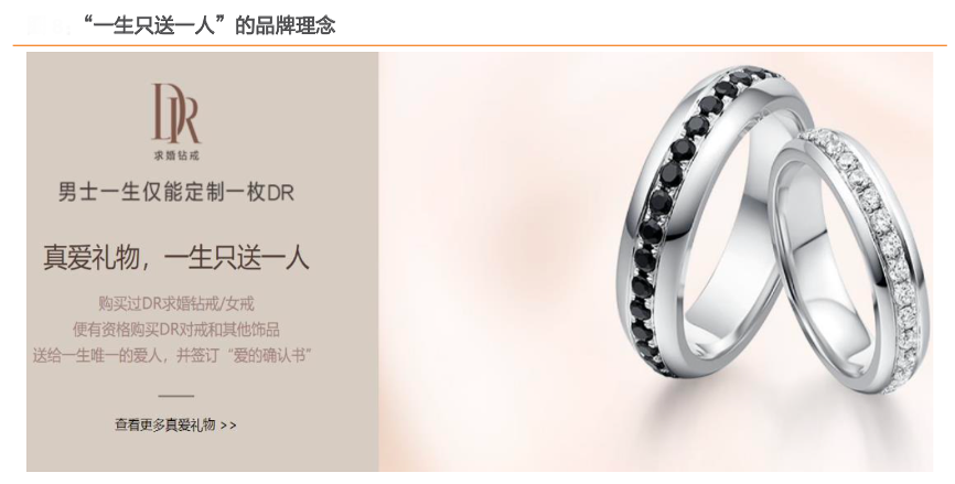 經典案例:根據公司官網、天風證券研究所等綜合資訊表明,DR品牌自創立開始即堅持“一生只送一人”的購買規則,消費者一生僅可將其購買的 DR 產品贈予唯一一位受贈人。其還為消費者提供了真愛協議、愛的確認書、門店協辦求婚儀式等一系列增值服務,給消費者帶來了更豐富的服務體驗,進一步強化了品牌內涵和消費者的情感滿足。