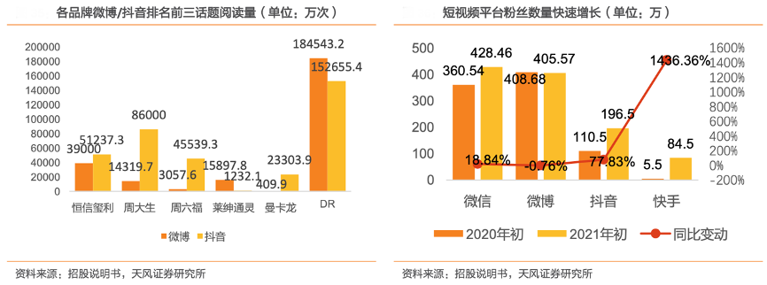 經典案例:根據招股說明書、天風證券研究所等綜合資訊表明,截至目前,DR 已在微博、微信、抖音、快手、小紅書等知名互聯網平臺擁有超過2000萬粉絲,在社交類和視頻類平臺的粉絲數量均領先于同行業可比公司。以微博舉例,截止 2021 年 10 月 7 日,DR 相關熱門話題如“#dr#”、“#我是 dr 族#”、“#dr 鉆戒#”、“#亞洲 dr 男神評選#”、“#Yes to DR#” 等有近 20 億次的閱讀以及約 48 萬次的討論,在以上話題中,DR 通過情感話題、“男神評選”等制造熱點,吸引流量,從而與大批消費者或潛在消費者之間形成良好的互動關系。