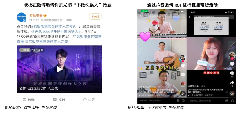 經(jīng)典案例:根據(jù)微博APP、環(huán)球家電網(wǎng)、中信建投等綜合資訊表明,洗碗機(jī)品類消費(fèi)者主要集中于 80 和 90 后的年輕群體,對(duì)于新興互聯(lián)網(wǎng)模式的營銷推廣接受程度更高。從需求端消費(fèi)群體的這一特點(diǎn)出發(fā),老板自發(fā)力洗碗機(jī)品類以來借助明星直播、話題討論、抽獎(jiǎng)互動(dòng)等一系列新興產(chǎn)品推廣方式提升產(chǎn)品曝光度。勢(shì)頭迅猛且迎合年輕消費(fèi)群體的營銷方式為老板洗碗機(jī)品類短期內(nèi)市場(chǎng)份額的快速提升提供了強(qiáng)大助力。