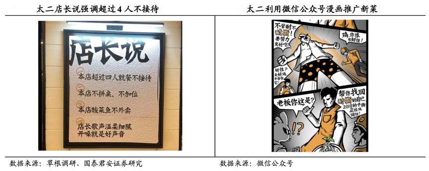 經典案例:根據草根調研、微信公眾號、國泰君安證券研究等綜合資訊表明,太二打造獨特品牌文化。(1)打造IP:設計“二老板”和“小二哥”的 IP 形 象,通過漫畫故事打造人物。(2)反向營銷;太二店長說強調原則“超過4人不接待、不拼桌不加位等”,塑造獨特二文化。(3)打造特色門店:周年打造快閃店,包括二周年慶快閃博物館、三周年慶中醫館、四周年慶酸菜探索基地、五周年慶太二澡堂、六周年慶太二發廊;開設超級粉絲店。