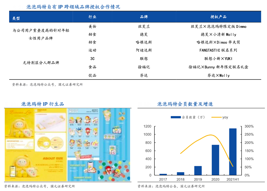 經典案例:根據泡泡瑪特公眾號、泡泡瑪特公告、國元證券研究所等綜合資訊表明,潮流零售品牌商多通過老IP 新造型新衍生品、連續舉辦主題展、授權跨領域聯名等方式提升 IP 影響力、延長 IP 生命周期。以泡泡瑪 特為例,其 于2019年底至 2020 年初在中國七大城市連續舉辦以熱門 IP 為核心 的主題展,在此期間宣傳、促銷節日或地區限定產品;與絲芙蘭、德芙、哈根達斯、 阿迪達斯運動、徐福記、芬達等多行業品牌推出聯名商品,提升 IP 知名度。根據泡泡瑪特公告,2021H1 公司會員數量達 1141.5 萬人,同比增長 54%,會員復購率達 49%,會員銷售額貢獻達 91.8%。