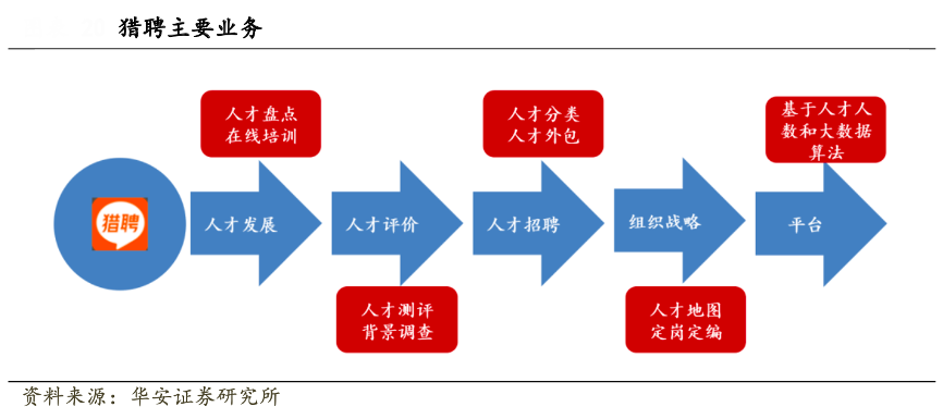 經典案例:根據公開資訊、華安證券研究所等綜合資訊表明,同道獵聘是一家以科技和大數據驅動的人才服務智能平臺,其核心業務是中高端人才招聘平臺,將求職和招聘活動線上化,基于大數據與人工智能搭建以“獵聘網”為基礎的互聯網平臺,開啟以用戶體驗為核心的交易模式。獵聘布局人力資源產業鏈,提供一體化人才解決方案。