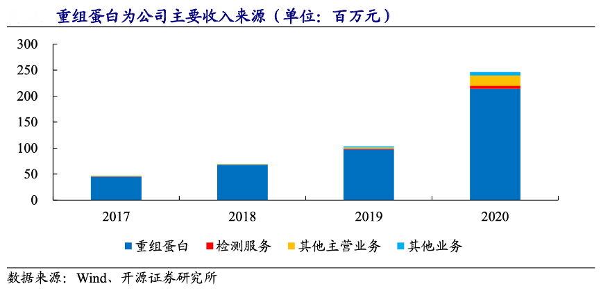 經典案例:根據wind、開源證券研究所等綜合資訊表明,分業務看,現階段“重組蛋白”是百普賽斯公司收入的主要來源,同時,借助其超過 1700 種的重組蛋白積極拓展藥物的研發、篩選、臨床試驗、生產質量監控等檢測服務, 該業務的收入規模穩步提升。