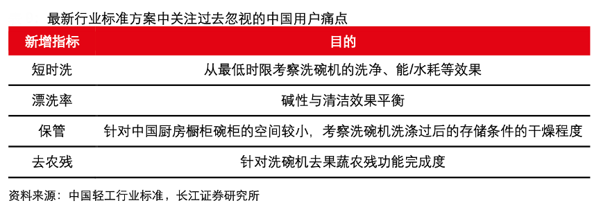 經典案例:根據中國輕工行業標準、長江證券研究所等綜合資訊表明,2021年洗碗機相關的行業標準再次升級,從目前的提案看,新修訂方案除了在潔凈指數、干燥指數、能源效率指數、水效率指數上較 2013 年 QB/T1520-2013 大幅提 高了標準,還針對過去用戶忽視的痛點新增相關指標,包括短時洗、漂洗率、保管、去 弄殘等。熱點賣點集中推出,疊加行業標準的提升與深入,將為洗碗機市場注入新的驅動力。