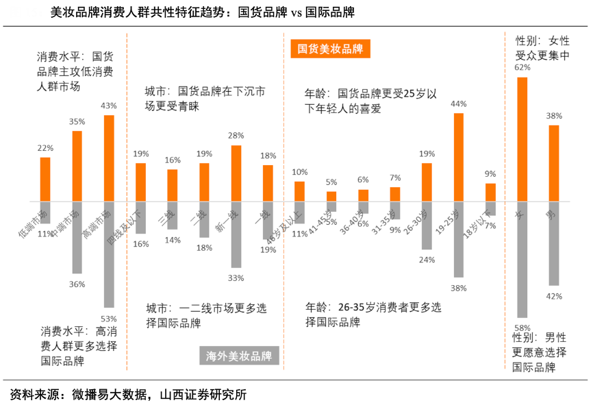經典案例:根據微博易大數據、山西證券研究所等綜合資訊表明,國貨美妝品牌的目標用戶以 25 歲以下、三線及以下城市的 95 后女性消費者為主。微博易大數據顯示,國貨美妝品牌中低端消費占比約為 78%,下沉市場消費占比約為 54%,25歲以下的消費者占比約為 53%。