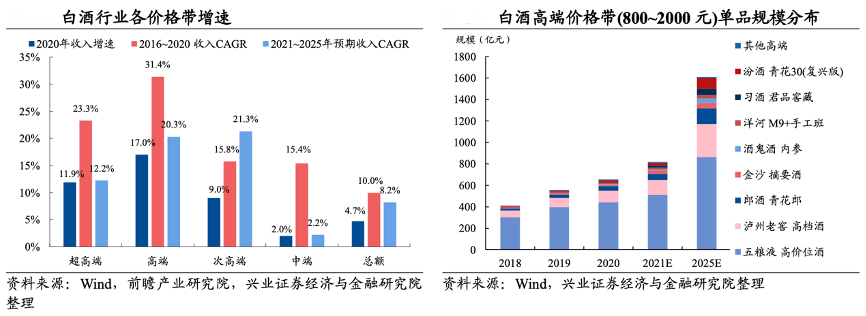 經典案例:根據wind、前瞻產業研究院、興業證券經濟與金融研究院等綜合資訊表明,從高端價格帶格局來看,由于高端品牌積淀具備強壁壘,高端入場券稀缺,頭部品牌將充分享受千元價格帶擴容紅利。由于高端形象需要深厚的歷史文化積淀及品牌心智占領,頭部品牌馬太效應明顯,預計高端品牌競爭格局保持穩定。參考頭部品牌十四五增長規劃,預計超高端價格帶(2000+元)未來 5 年將達到 1500 億元規模,對應 5 年 CAGR 約為 12%;高端價格帶(800~2000 元)未來 5 年將達到 1600 億元規模,對應 5 年 CAGR 約為 20%。