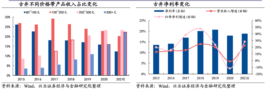 經典案例:根據wind、興業證券經濟與金融研究院等綜合資訊表明,2021 年以來,受益安徽省內大眾消費價格帶全面向 120~200 元升級,鄉鎮宴席及送禮產品全面向古 8、洞 6/洞 9 等產品切換,同時商務消費價格帶向 600 元價位 擴張,古井公司果斷以古 20 提價布局這一新興價位,古 16 性價比也相應得到凸顯。