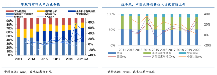 經典案例:根據wind、民生證券研究院等綜合資訊表明,分產品來看,賽默飛主要有實驗室產品和服務、生命科學解決方案、工業和應用及臨床和診斷四大業務板塊。實驗室產品和服務是公司一直以來的支柱產品,收入占比長期高達 1/3。自 2014 年以來,生命科學解決方案板塊開始貢獻收入,2020年創收 121.68億美元,同比增長77%。