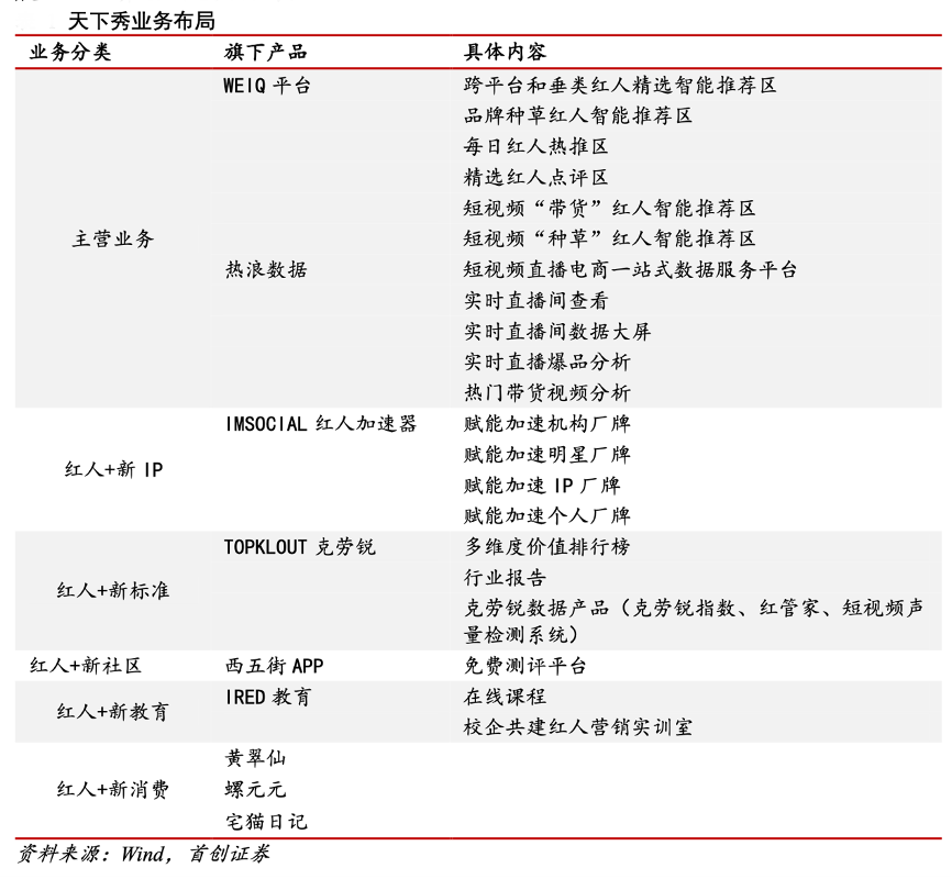 經(jīng)典案例:根據(jù)wind、首創(chuàng)證券等綜合資訊表明,天下秀以紅人營(yíng)銷為主營(yíng)業(yè)務(wù),配套推出“紅人+新 IP”、“紅人+新標(biāo)準(zhǔn)”、“紅人+新社區(qū)”、“紅人+新 職業(yè)”、“紅人+新消費(fèi)”等紅人經(jīng)濟(jì)生態(tài)鏈創(chuàng)新性業(yè)務(wù),紅人經(jīng)濟(jì)業(yè)務(wù)布局日漸完善。截至 2021 年上半年,WEIQ 平臺(tái)的活躍商家客戶數(shù)已達(dá)到 5,165 個(gè),為 2020 年全年客 戶數(shù)的61.92%。