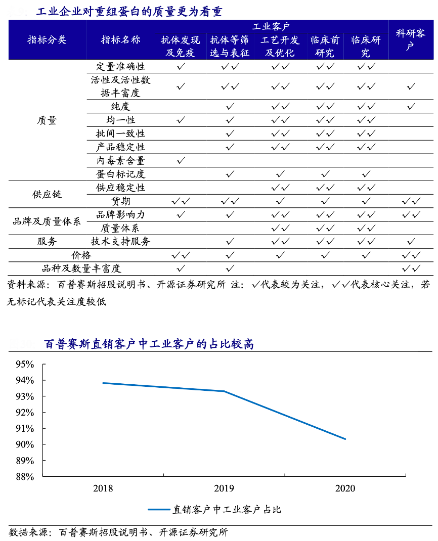 經(jīng)典案例:根據(jù)普賽斯招股說明書、開源證券研究所等綜合資訊表明,百普賽斯是一家專業(yè)提供重組蛋白等關(guān)鍵生物試劑產(chǎn)品及技術(shù)服務(wù)的高新技術(shù)企業(yè)。其主要向?qū)|(zhì)量要求更高的工業(yè)客戶提供重組蛋白,近幾年公司直銷工業(yè) 客戶的占比一直高達(dá) 90%以上。其已全覆蓋輝瑞、默克、強(qiáng)生等全球 Top20 的生物醫(yī)藥企業(yè),并對(duì)全球Top50 生物醫(yī)藥企業(yè)覆蓋率達(dá)到80%;同時(shí),對(duì)恒瑞醫(yī)藥、藥明生物、信達(dá)生物等國(guó)內(nèi)頭部生物醫(yī)藥客戶也基本全覆蓋。