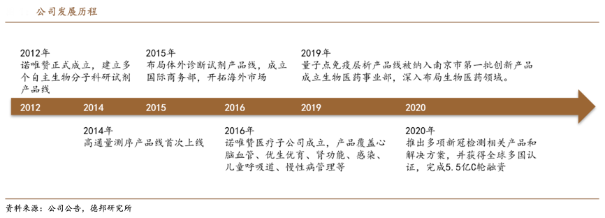 經典案例:根據公司公告、德邦研究所等綜合資訊表明,諾唯贊生物成立于 2012 年,業務覆蓋生物試劑、體外診斷和生物醫藥,是一家圍繞酶、抗原、抗體等功能性蛋白進行技術研發和產品開發的生物科技企業,擁有 500 多個終端產品,可廣泛應用于科學研究、高通量測序、體外診斷、醫藥及疫苗研發和動物檢疫等領域,是國內少數同時具有自主可控上游技術開發能力和終端產品生產能力的研發創新型企業。