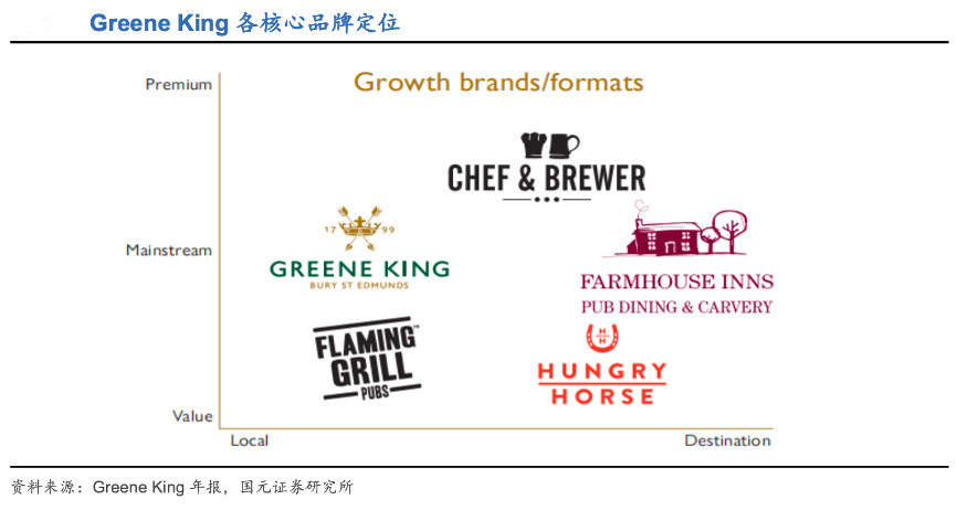 經(jīng)典案例:根據(jù)Greene King 年報、國元證券研究所等綜合資訊表明,2020 年 Greene King 有 1672 家酒吧公司,酒吧公司業(yè)務(wù)占總營收比為 81%,為公司營收增長的關(guān)鍵驅(qū)動力,4 個核心品牌分別為 Greene King Locals(酒飲主導(dǎo)的地方酒吧)、Hungry Horse(酒飲與食物結(jié)合的特色酒吧)、Chef & Brewer(食品主導(dǎo)的中端品牌)、Farmhouse Inns(傳統(tǒng)鄉(xiāng)村的特色酒吧)。其通過構(gòu)建豐富的品牌矩陣、差異化運作各品牌,實現(xiàn)精準(zhǔn)定位及多維覆蓋目標(biāo)客群,塑造不同檔次、不同價格的品牌形象以抓取偏好各異的消費客群。