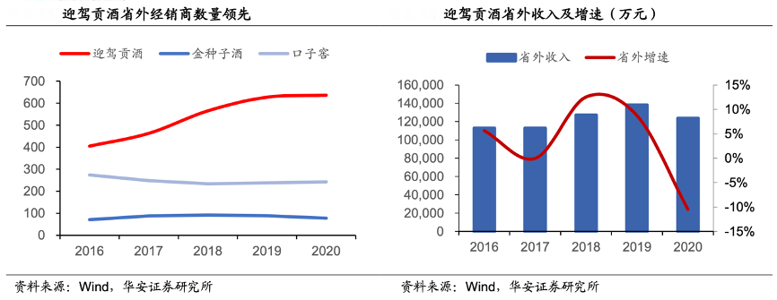 經(jīng)典案例:根據(jù)wind、華安證券研究所等綜合資訊表明,迎駕貢酒省外開拓核心市場,打造第二增長曲線。安徽省周邊的江蘇、山東、河南、湖南、湖北、江西等均為白酒消費大省,省外擴張前景廣闊,利于迎駕貢酒打造第二成長曲線。截止 2020 年,其省外收入和經(jīng)銷商數(shù)量不斷增加,省外收入為 12.3 億元,省外經(jīng)銷商數(shù)量為 636 家, 2016-2020 年省外經(jīng)銷商數(shù)量復合增速達 11.9%。