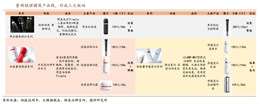 經典案例:根據招股說明書、天貓旗艦店、韓束品牌官網和德邦研究所等綜合資訊表明,2021年,韓束重新梳理精簡產品線,推進產品聚焦策略。韓束精減 SKU 形成流量型與價值型產品組合方案,圍繞國內領先科學抗衰品牌的定位形成三大板塊:1)抗衰+緊致:代表有聚時光奢養緊致系列、黑金臻養系列、 A 醇精華、金剛俠面膜。2)抗衰+彈嫩:代表有紅膠囊系列、韓束高保濕彈潤水。3)抗衰+美白:銀膠囊系列、凈透美白精華。