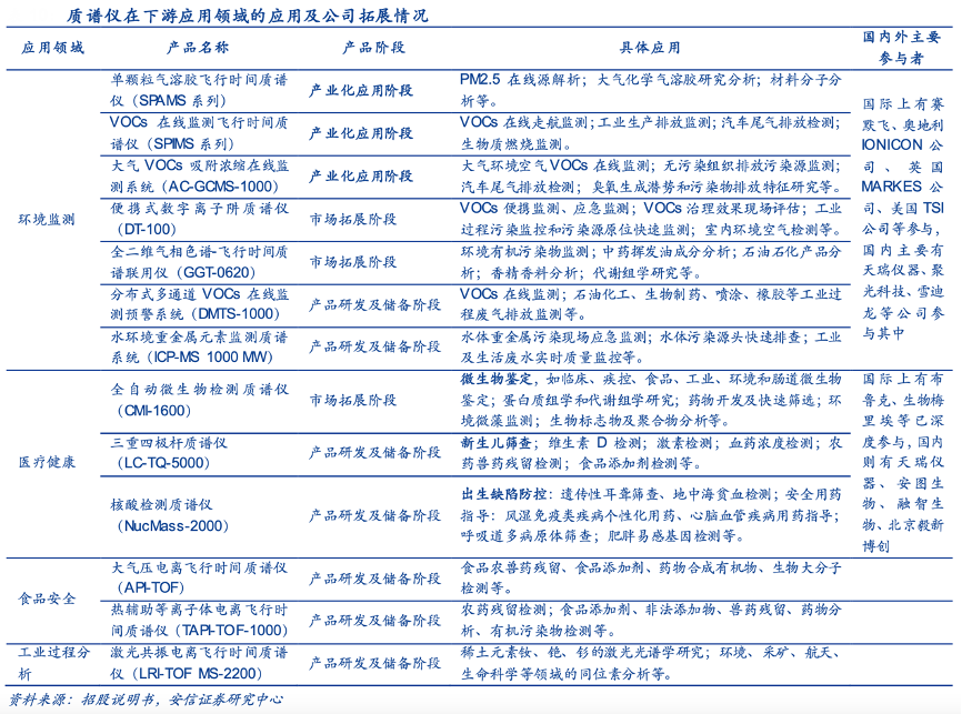 經(jīng)典案例:根據(jù)招股說(shuō)明書(shū)、安信證券研究中心等綜合資訊表明,禾信儀器公司的產(chǎn)品線布局涉及環(huán)境、醫(yī)療、食品及工業(yè)過(guò)程分析,目前已經(jīng)產(chǎn)業(yè)化應(yīng)用的產(chǎn)品主要是環(huán)境監(jiān)測(cè)領(lǐng)域的 SPAMS 和 SPIMS 以及 AC-GCMS-1000,均應(yīng)用于環(huán)境監(jiān)測(cè)領(lǐng)域;DT-100、 GGT-0620 及 CMI-1600(全自動(dòng)微生物檢測(cè)質(zhì)譜儀)處于市場(chǎng)拓展階段。