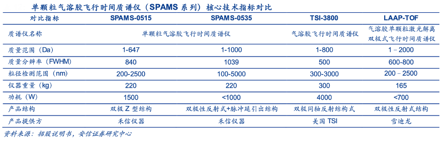 經(jīng)典案例:根據(jù)招股說(shuō)明書(shū)、安信證券研究中心等綜合資訊表明,禾信儀器公司 SPAMS 系列產(chǎn)品主要用于單顆粒氣溶膠的在線解析,技術(shù)路徑為飛行時(shí)間質(zhì)譜技術(shù)。其SPAMS-0515 在質(zhì)量范圍、質(zhì)量分辨率、粒徑檢測(cè)范圍方面與同行業(yè)同類(lèi)產(chǎn)品處于同一水平,而 SPAMS-0535 在質(zhì)量分辨率、粒徑檢測(cè)范圍方面則要優(yōu)于同行業(yè)同類(lèi)產(chǎn)品。