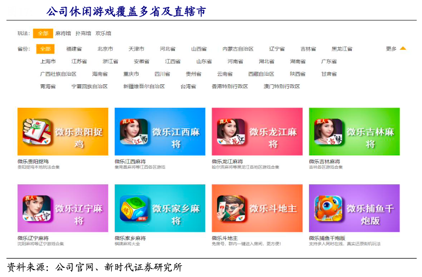 經典案例:根據(jù)公司官網(wǎng)、新時代證券研究所等綜合資訊表明,家鄉(xiāng)互動公司進軍整個休閑 游戲過程中塑造了微樂,科樂,吉祥三大游戲品牌,根據(jù) 2020 年財報顯示,其目前提供的本地化麻將玩法變種,至少覆蓋中國 28 個 省及直轄市的部分縣城。僅 2020 年內,其推出了 54 款新麻將玩法變種、18 款新?lián)淇送娣ㄗ兎N 及 2 款休閑游戲,基本實現(xiàn)對主流棋牌游戲玩法的全覆蓋。
