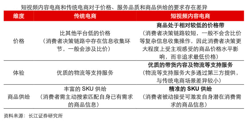經典案例:根據長江證券研究所等綜合資訊表明,短視頻內容電商所承載的消費需求是潛在需求,且消費者決策鏈路較短,決定成交轉化效率的關鍵在于商家是否能夠以“具有吸引力”的價格、最好的內容體驗為消費者提供“與需求最匹配”的商品,從而實現對潛在需求的激發轉化,這一底層邏輯與在傳統電商場景下需要以“最低”的價格最好的服務供給“最豐富”的商品,并與滿足消費者已有需求的特點存在較大差異。