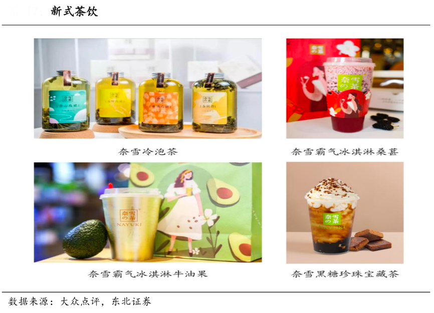 經典案例:根據招股說明書、東北證券等綜合資訊表明,以喜茶、奈雪的茶為代表的高端新式茶飲品牌在新消費浪潮下,引領整個現制茶飲行業邁入高端化。高端茶飲品牌推出水果茶、奶蓋茶等創新品類,突破了奶茶的“甜”“膩”屬性;拓寬茶飲的消費場景,通過布局 50- 200 平的大面積門店,賦能新茶飲社交、休閑屬性;定位高端,商品單價通常在 20- 35 元,大單品+不斷推新維持品牌熱度。