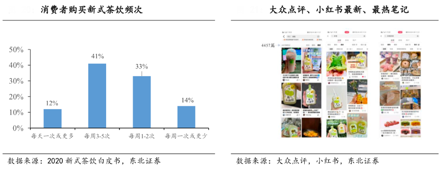 經典案例:根據《2020新式茶飲白皮書》、大眾點評、小紅書、東北證券等綜合資訊表明,購買新式茶飲的消費者其中 41%每周會購買 3-5 次新式茶飲。喜茶等品牌將饑餓營銷引入高端 茶飲行業,核心產品限量供應增加了消費者購買和打卡的欲望,營造了稀缺和高附加值的品牌形象,大眾點評 app 上關于奈雪的 分享筆記高達 4457 篇,可見高端茶飲優質的產品和舒適的店內環境讓消費者有著分享的熱情與動力,而且有著留住老客吸引新客的能力。