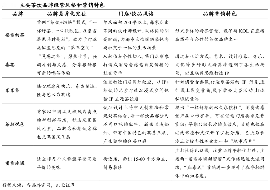 經(jīng)典案例:根據(jù)各品牌官網(wǎng)、東北證券等綜合資訊表明,高端茶飲品牌主要面向高線城市年輕白領(lǐng),特別是年輕女性白領(lǐng),提供高品質(zhì)的茶飲和舒適的空間體驗(yàn),在品牌調(diào)性和營(yíng)銷策略上各不相同,喜茶聚焦于茶,強(qiáng)調(diào)原創(chuàng)和靈感,奈雪的茶將“茶飲+烘焙”和第三空間作為營(yíng)銷重點(diǎn),樂(lè)樂(lè)茶突出快樂(lè)和樂(lè)茶君 IP 形象打造;中端茶飲品牌中,茶顏悅色文化屬性特征明顯,充滿中國(guó)風(fēng)的品牌 Logo 和產(chǎn)品名稱吸引了消費(fèi)者極大關(guān)注,與長(zhǎng)沙旅游深度綁定、“長(zhǎng)沙名片”的形象為其帶來(lái)源源不斷的客流。