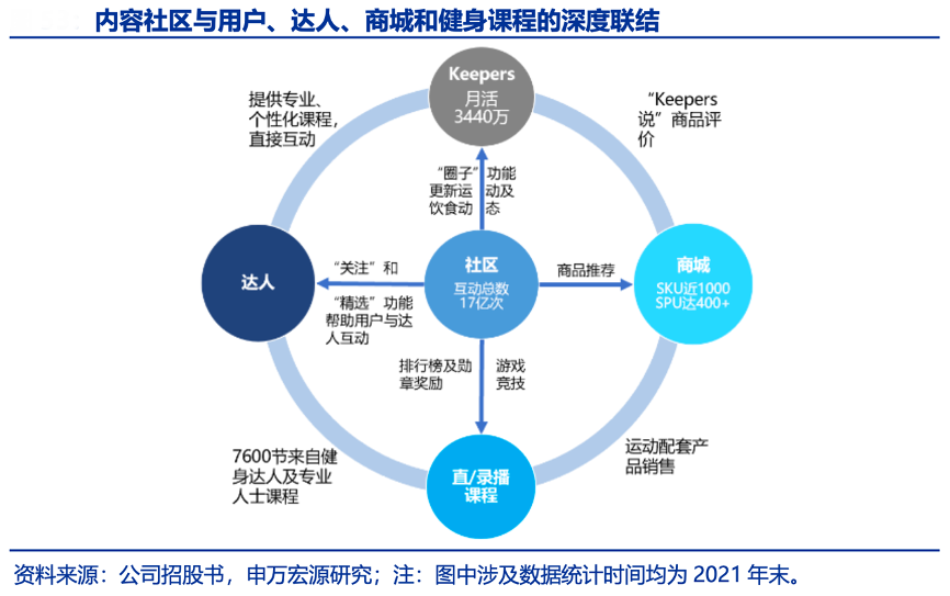 經典案例:根據公司招股書、申萬宏源研究等綜合資訊表明,Keep以社區為入口,用戶可以自由查看達人動態并與其他 keepers 互動交流;運動中,用戶可通過組隊競技、分組游戲化挑戰提高其在直、錄播課程中的體驗感和參與感;此外,keepers 推 薦和評價便于為健身品商城引流,完成業務變現的閉環。根據招股書,2021年,平臺社區互動總數達 17 億次,用戶將平臺的內容直接從 Keep 分享到社交媒體平臺累計超過 3900萬次;平臺在微博上積累了約 12 億次瀏覽量。2020 年平臺核心用戶的平均第 12 個月留存率為 49.3%,表現出強大的用戶忠誠度及黏性。
