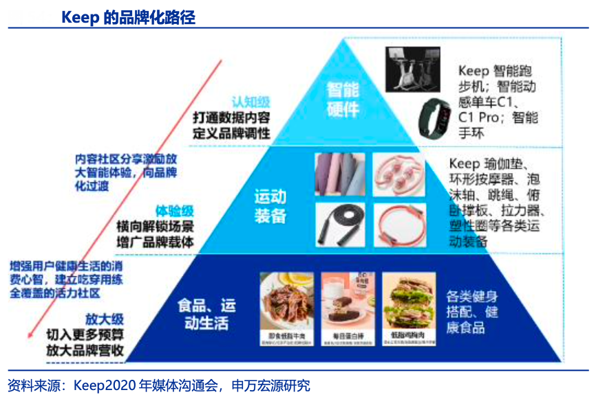 經典案例:從Keep2020年媒體溝通會、申萬宏源研究等綜合資訊表明,Keep以內容社區為依托,Keep建立起代表健康生活方式的“下一代品牌”,其自有品牌消費品全面覆蓋用戶健身生命周期。內容社區的使用分享、達人推薦放大了產品使用體驗和營銷效果、激勵用戶運動,長期具備高活躍度和高影響力的內容社區在用戶之間建立起了健康生活的消費心智,進而促進了運動裝備類、 輕食類及運動服飾類自有品牌產品的銷售,其或將迎來品牌溢價下,“吃、穿、用、練” 多場景、全覆蓋的營收增長。