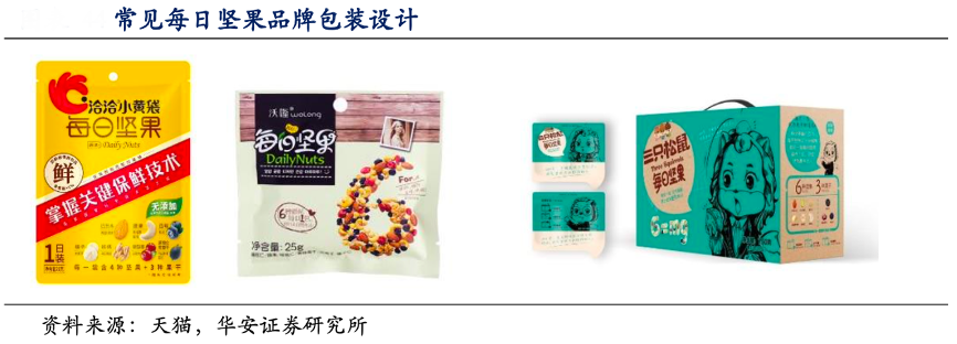 經典案例:根據天貓、華安證券研究所等綜合資訊表明,從包裝來看,洽洽的小黃袋每日堅果選用黃色作為包裝的主色調,帶來較為強烈的視覺沖擊效果,特別是在線下零售鋪貨的渠道中,更容易誘發消費者的購買行為;包裝封面帶有綬帶狀紅底白色的“掌握關鍵保鮮技術”的標識,讓消費者第一時間能了解產品的核心優勢和競爭力,具有高辨識度的特征。