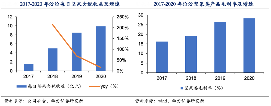 經典案例:根據公司公告、wind、華安證券研究所等綜合資訊表明,洽洽食品差異化精準定位,新鮮質造助力小黃袋每日堅果成功。產品上,原料海外當季直采,嚴格把握產品新鮮、優質,以小黃袋為中心,橫向延伸益生菌每日堅果、每日堅 果燕麥片等新品;技術上,將掌握關鍵保鮮技術作為超級口號,第一個提出保鮮技術與差異化,多年創新經驗助力技術難關突破;品牌上,堅持宣傳“新鮮”差異化定位,突圍品類競爭,進行品牌戰略設計與打造,建立洽洽全球領“鮮”的認知,用一抹紅綬帶,占據消費者心智,引領堅果行業新鮮升級。