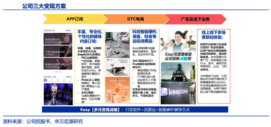 經(jīng)典案例:根據(jù)公司招股書、申萬宏源研究等綜合資訊表明,以流量為基礎(chǔ),Keep公司打造軟件+消費品+智能硬件的健身生態(tài),降低運動門檻,提升運動體驗,在全流程運動方案中促成流量變現(xiàn)。目前其公司的收入來源主要包括會員訂閱及線上付費內(nèi)容、自有品牌產(chǎn)品、廣告和其他服務(含線下健身館收入),2021年前三季度其收入占比分別為 33%、55%、12%,毛利率分別為59%、29%、60%。