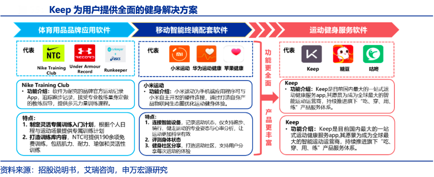 經(jīng)典案例:根據(jù)招股說明書、艾瑞咨詢、申萬宏源研究等綜合資訊表明,目前市場上能夠提供健身服務的軟件主要有三大類:以 Keep 為代表的運動健身服務軟件、以 Nike Training Club 為代表的體育用品品牌應用軟件和以華為健康為代表的移動智能終端配套軟件。Keep支持從線上到線下,從產(chǎn)品到服務,多場景滿足用戶的健身需求,具有“一站式”的優(yōu)勢,且相比于其他智能終端,keep 能夠有效激勵用戶參與,提供各類服務及產(chǎn)品簡化用戶的運動決策,是吃、穿、用、練全覆蓋 的智能健身平臺運營商。