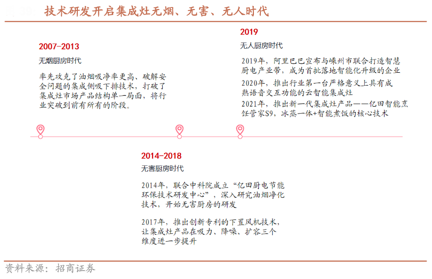 經典案例:根據招商證券等綜合資訊表明,集成灶的技術演進反映了從“無煙廚房”-“無害廚房”-“無人廚房”的烹飪場景升級趨勢,其中億田扮演著先行者與積極推動者的角色。2019年,億田公司成為嵊州產業基地首批智能化落地升級的企業,并分別于2020、2021 年推出第一臺配備語音交互功能的云智能集成灶、搭載冰蒸一體+智能煮飯核心技術的 S9 智能烹飪管家,將集成灶智能化推升到新的高度。