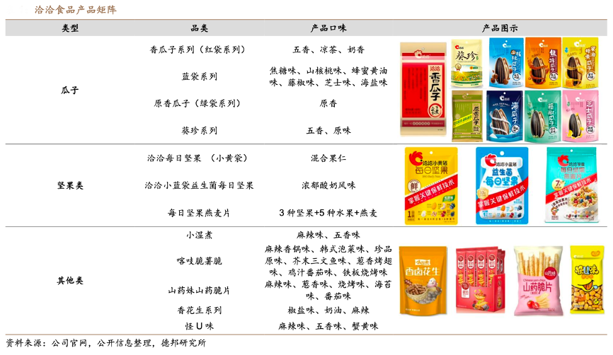 經典案例:根據公司官網、公開信息整理、德邦研究所等綜合資訊表明,洽洽食品在傳統優勢主業——瓜子品類上,其在經典紅袋系列基礎上,開發出藍袋及綠袋系列,在產品口味、包裝等 方面實現不斷的創新升級。同時推出高端瓜子品牌“葵珍”,進一步豐富瓜子產品矩陣布局。