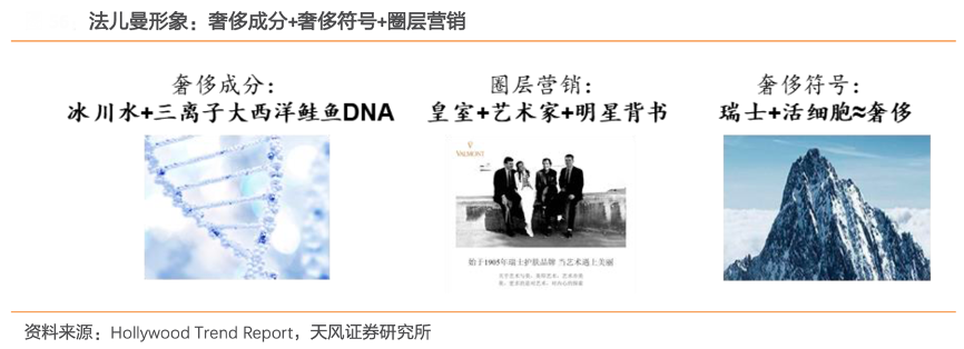 經(jīng)典案例:根據(jù)Hollywood Trend Report、天風(fēng)證券研究所等綜合資訊表明,從營(yíng)銷(xiāo)端來(lái)看,高端營(yíng)銷(xiāo)&藝術(shù)綁定是其打造高奢定位的重要方式。法兒曼積極與香奈兒女士和西班牙皇家十三世等名人合作,利用名人的較高知名度進(jìn)行宣傳,打造高奢形象。
