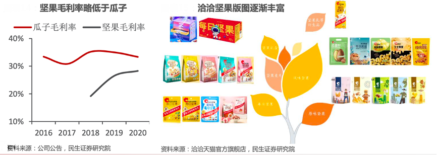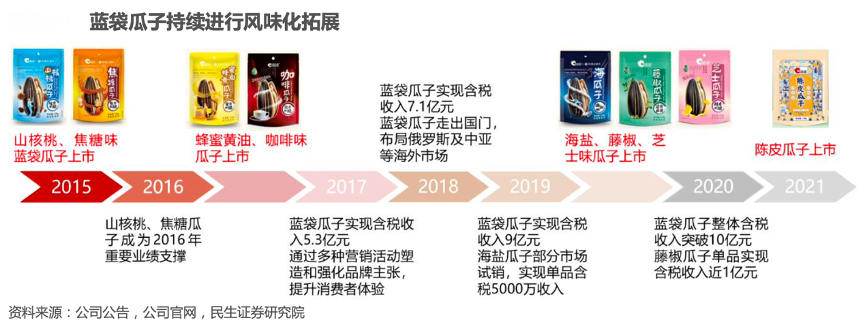 經(jīng)典案例:根據(jù)公司公告、公司官網(wǎng)、民生證券研究院等綜合資訊表明,洽洽以風(fēng)味化創(chuàng)新為突破口,2015年開始拓展藍(lán)袋風(fēng)味化瓜子,2016年即開始帶來明確業(yè)績增量,2020年藍(lán)袋瓜子含稅收入已突破10億,成為瓜子業(yè)務(wù)的重要增長點(diǎn)。