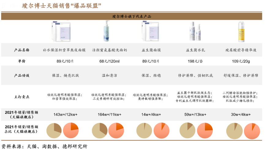 經(jīng)典案例:根據(jù)天貓、淘數(shù)據(jù)、德邦研究所等綜合資訊表明,璦爾博士借助小紅書等新媒體社交平臺投放軟廣,主要與腰部博主合作,借助其粉絲基礎(chǔ)擴大品牌知名度;通過選擇 KOC 做心得分享,使得品牌可以借助信任值更高、營銷屬性更低的普通消費者進行品牌營銷。由“積雪草熬夜面膜”、“潔顏 蜜氨基酸洗面奶”、“益生菌面膜”、“益生菌水乳”和“玻尿酸前導(dǎo)精華液”五款產(chǎn)品構(gòu)成的“爆品聯(lián)盟”2021年總銷售額占整店銷售額比例超過80%。