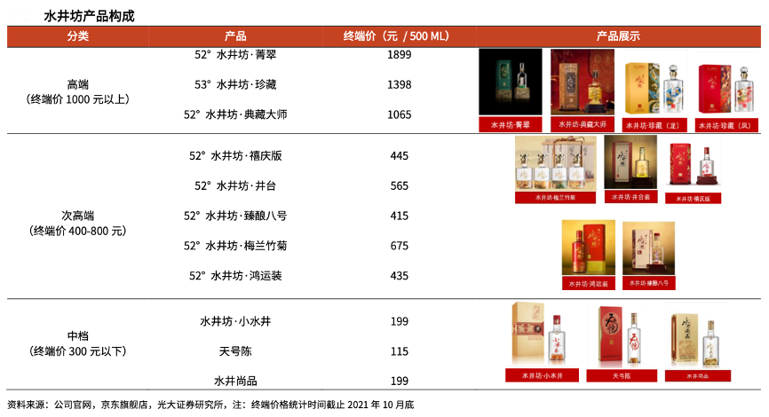 經典案例:根據公司官網、京東旗艦店、光大證券研究所等綜合資訊表明,水井坊主要圍繞井臺、臻釀八號、典藏三大單品搭建自有產品體系,卡位次高端及高端市場。高端產品以典藏為主,輔以菁翠、珍藏(龍鳳)等產品,目前占比較低、約5%左右,次高端以井臺、臻釀八號兩大單品為主,并運行禧慶版、鴻運裝等產品以瞄準細分場景,井臺、臻釀八號系列為公司貢獻主要收入。