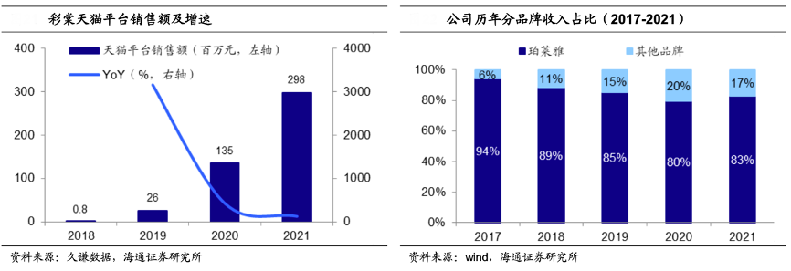 經典案例:根據久謙數據、wind、海通證券研究所等綜合資訊表明,從分品牌收入結構看,2017年以來珀萊雅公司其他品牌的收入占比穩步提高,從 2017 年的 6%逐年提升至 2021 年的 17%。其中,彩棠天貓平臺銷售額由2020 年的 1.35 億 元上升至 2021 年的 2.98 億元,同比增長 121%,是驅動其他品牌收入增長的主力。
